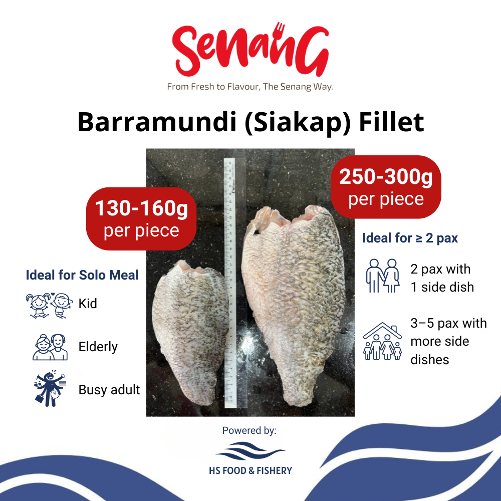 Enjoy the delightful taste of Senang Foods Premium Fresh Frozen Siakap (Barramundi) Boneless Fillet, perfect for your seafood cravings.